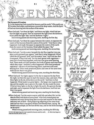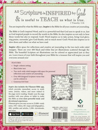Inspire is a single-column, wide-margin New Living Translation Bible that will be a cherished resource for coloring and creative art journaling. It’s the first Bible of its kind―with over 400 beautiful line-art illustrations spread throughout the Bible. Full-page and partial-page Scripture art is attractively displayed throughout the Bible, and the illustrations can be colored in to make each Bible unique, colorful, and customizable. Every page of Scripture has two-inch-wide margins, with either Scripture line-art or ruled space for writing notes and reflections, or to draw and create. The generous 8.65-point font ensures optimal readability, and quality cream Bible paper is great for creative art journaling. Inspire is available in the popular New Living Translation and is designed uniquely to appeal to art-journaling and adult coloring book enthusiasts.