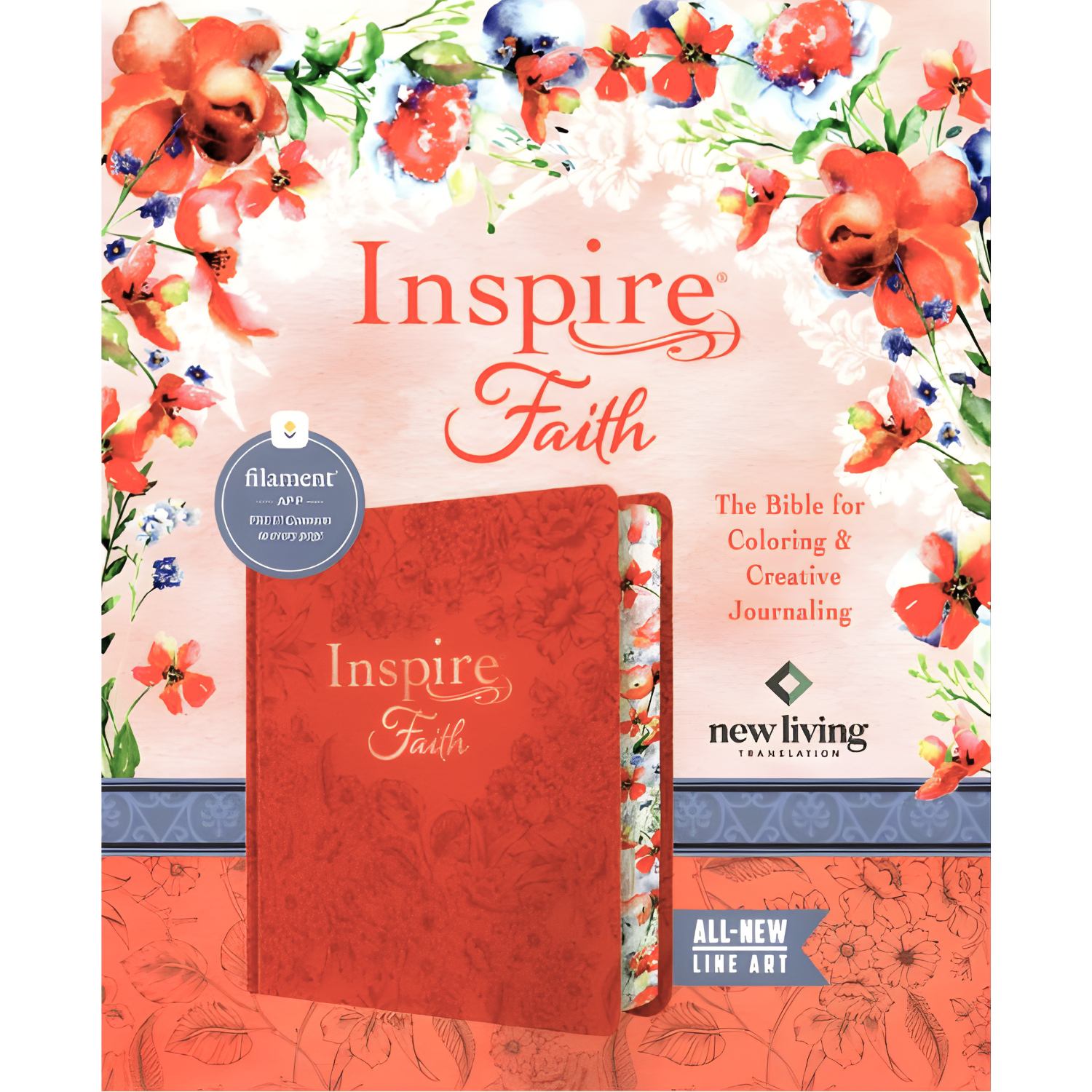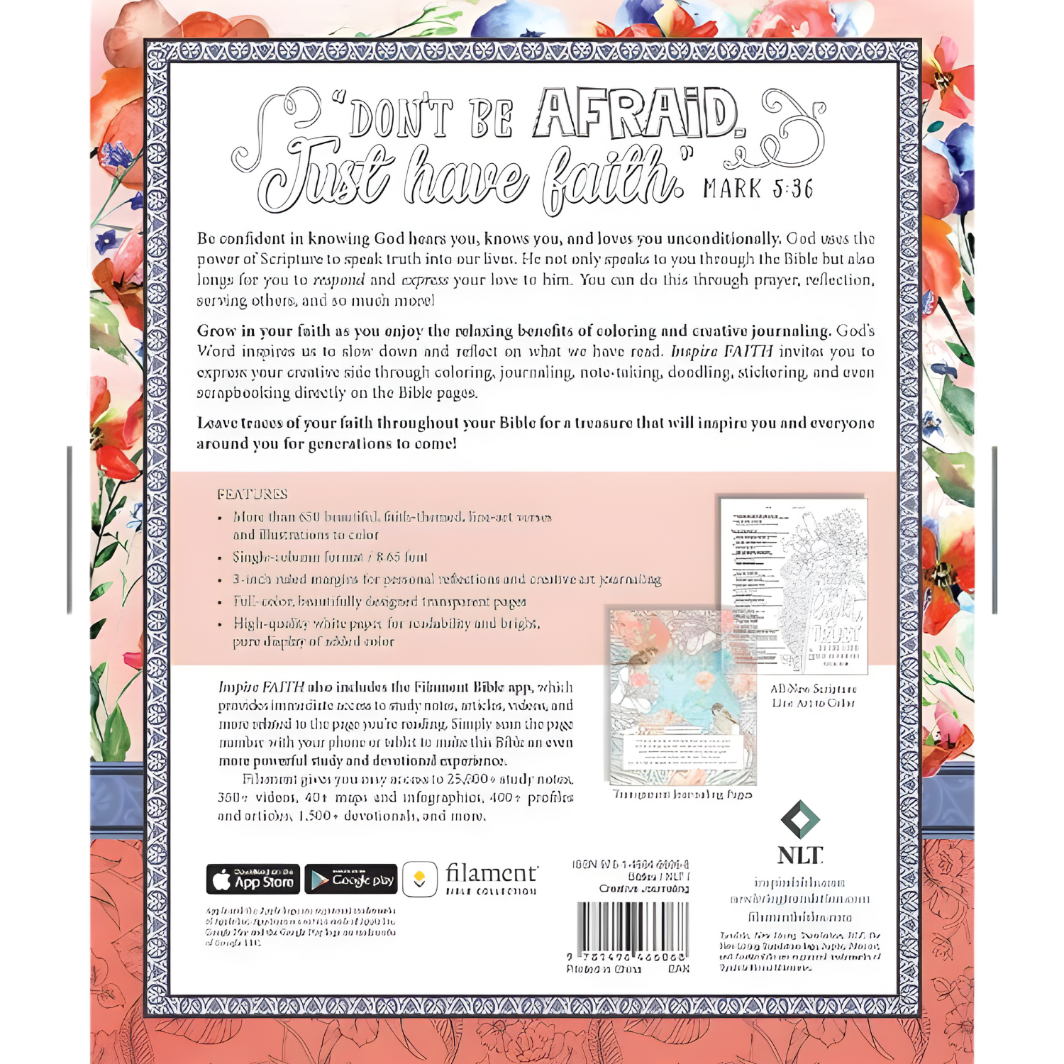 Inspire FAITH Bible, Filament-Enabled Edition (NLT) invites you to nourish your spirit through coloring, creative journaling, and meaningful Bible study. Featuring a single-column design with wide, lightly ruled margins and 655 beautiful Scripture illustrations to color, this Bible is perfect for reflection and creativity. With larger, easy-to-read text and high-quality paper, it’s ideal for journaling right on the pages. The Filament Bible app adds study notes, devotionals, maps, videos, and music—turning this creative Bible into a powerful digital study companion whenever you choose to go deeper.