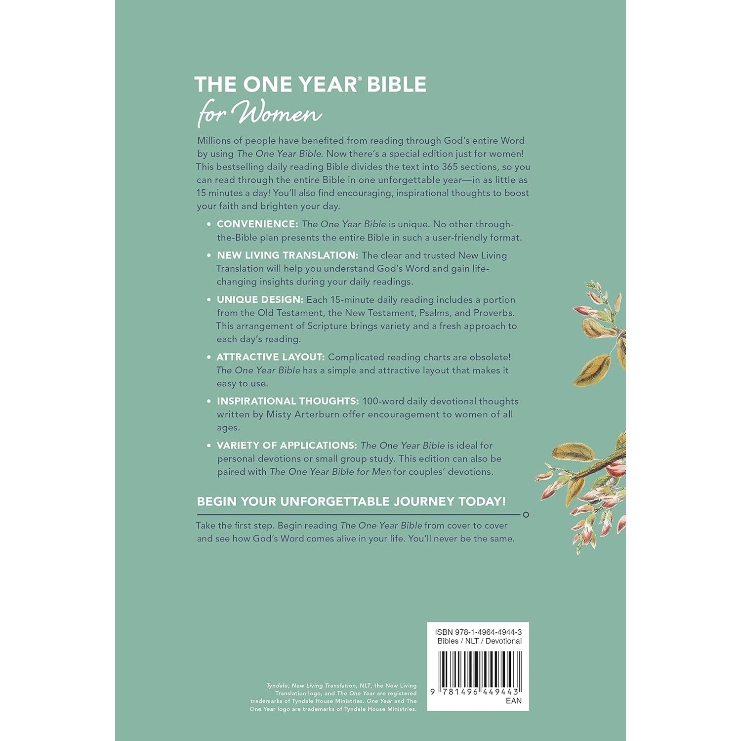 Read through the entire Bible in one year in as little as 15 minutes a day with this specially designed NLT devotional Bible for women. Combining daily Scripture readings with brief, encouraging devotionals, it helps women grow spiritually and engage with God’s Word every day.