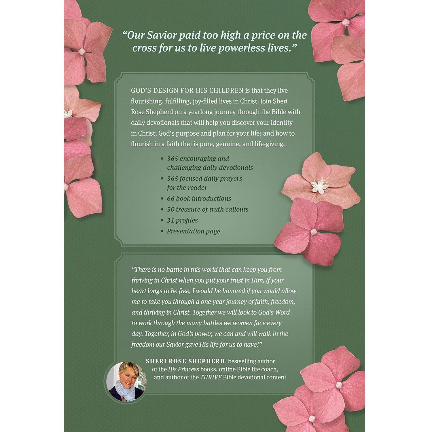 The THRIVE Devotional Bible for Women is a yearlong journey designed to help women know God more deeply and live joyfully in Christ. Guided by bestselling author Sheri Rose Shepherd, each daily reading includes a key Scripture, a love letter from God, a reflection, a Treasure of Truth, and a prayer—encouraging women to embrace their identity in Christ and lay their burdens at the cross.